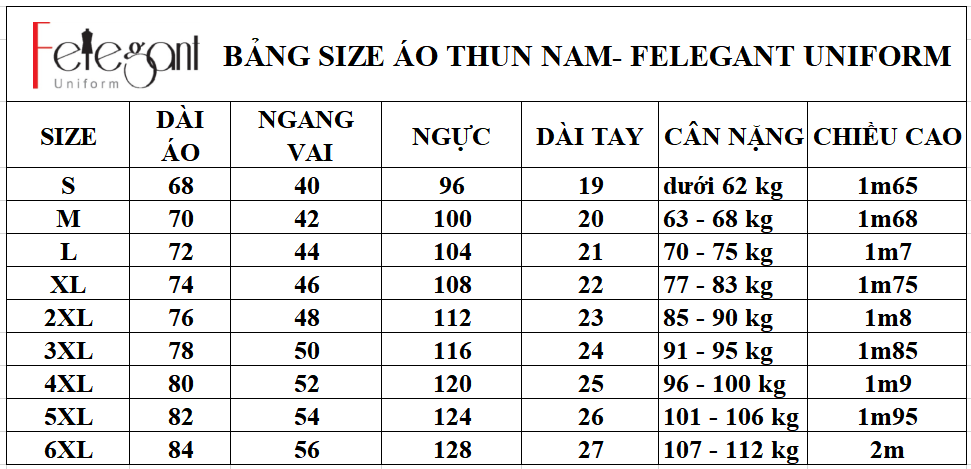 Bảng thông số size đồng phục áo thun công ty du lịch tại Đồng Phục Felegant