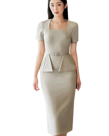 Đồng phục đầm liền cổ vuông công sở cao cấp tôn dáng sang trọng, che khuyết điểm bụng to, giúp người mặc tự tin, thoải mái khi mặc