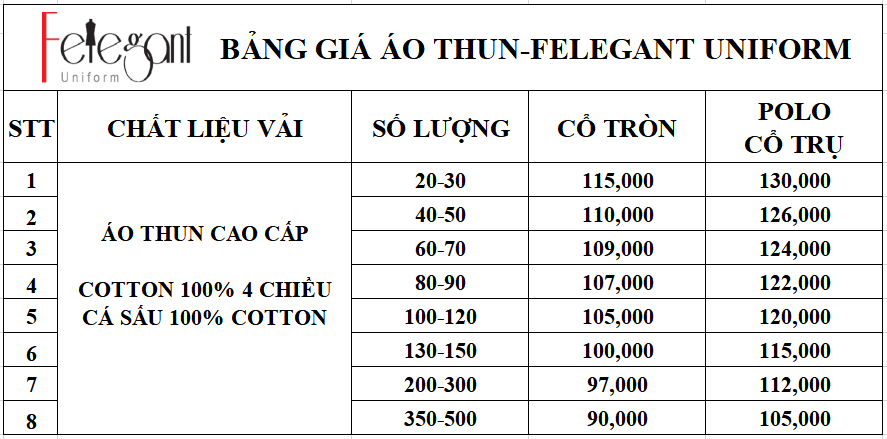 Bảng thông số size đồng phục áo thun nhóm tại Đồng Phục Felegant
